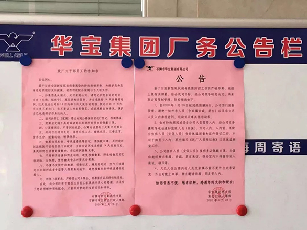 1.加強宣傳引導,凝聚抗“疫”思想意識 生命重于泰山,疫情就是命令,防控就是責任,宣傳就是力量。為了打好疫情攻堅戰,華寶集團黨支部和企業管理人員凝聚了廣面宣傳的共識,充分利用了員工公告欄、車間廣播、橫幅、微信群、宣傳手冊等方式向在廠員工宣傳防疫知識,發動周邊群眾,全面參與防控.