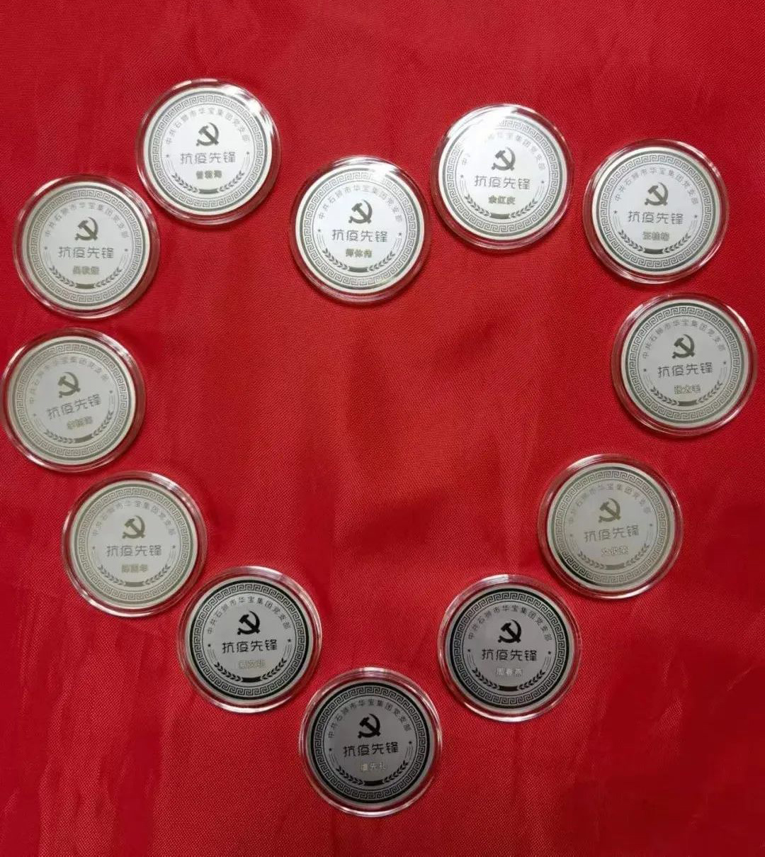 (上圖為獲得紀念章的黨員合集。“抗疫先鋒”紀念章由50g純銀打造,刻制專屬姓名和單位)