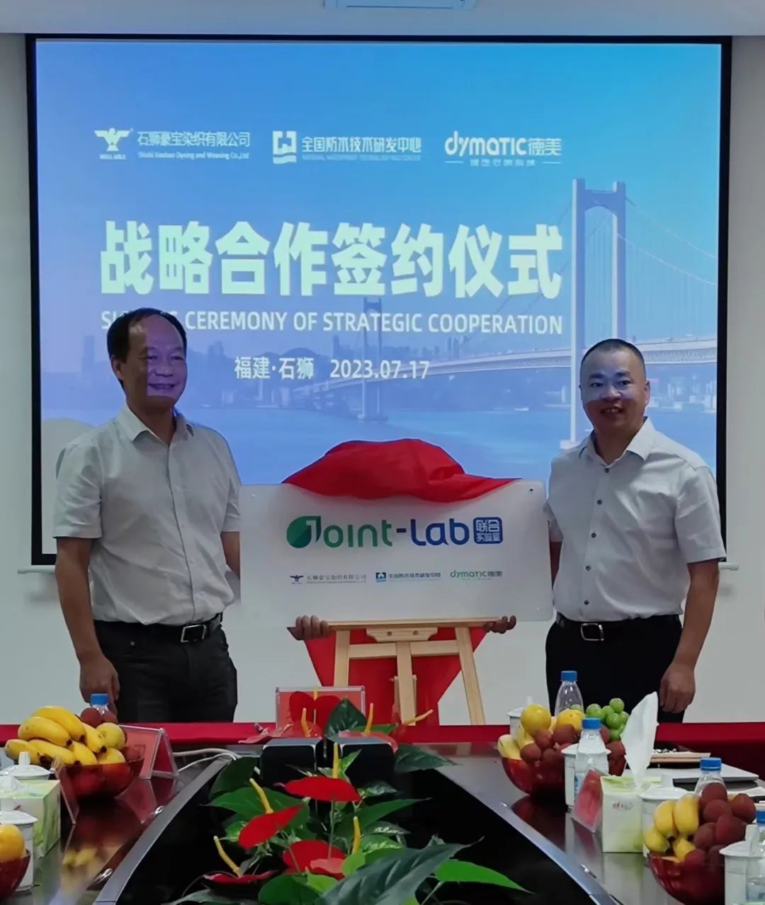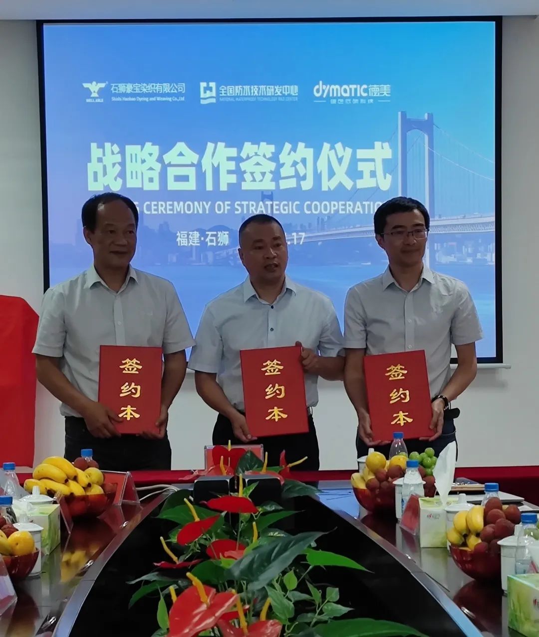 簽約現(xiàn)場(chǎng) 2023年7月17日,石獅市豪寶染織有限公司、全國(guó)防水技術(shù)研發(fā)中心和廣東德美精細(xì)化工集團(tuán)股份有限公司三方簽署建立了防水聯(lián)合實(shí)驗(yàn)室合作協(xié)議,此舉可以促進(jìn)三方相互聯(lián)系與合作,推動(dòng)紡織產(chǎn)業(yè)技術(shù)研發(fā)和提質(zhì)增效。