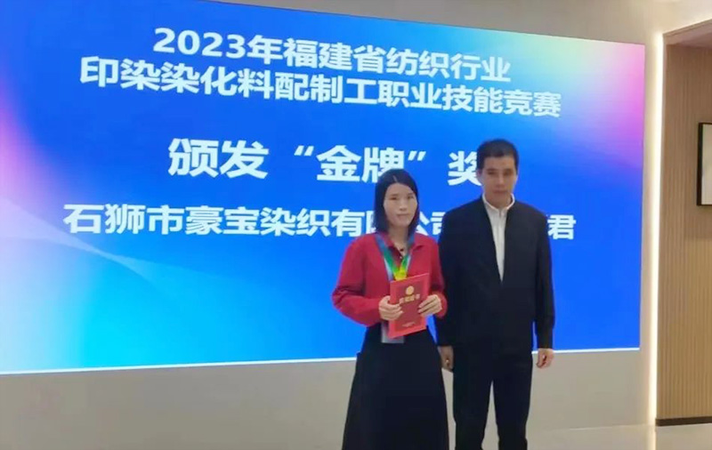 周麗君自2017年5月入職豪寶染織,現任配色副科長,工作矜矜業業、任勞任怨、業務精湛。這次經華寶集團工會推選,周麗君作為石獅市印染企業染化料配制工8名代表之一,參加2023年福建省紡織行業印染染化料配制工職業技能競賽,并取得優異成績,可喜可賀、振奮人心。希望華寶集團的所有員工向周麗君學習,愛崗敬業,勤勞奉獻,不斷精進業務能力,提高職業技能水平。