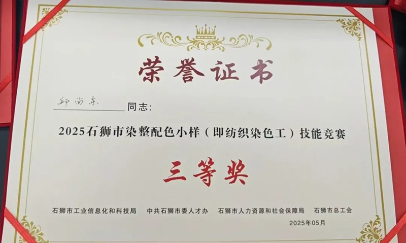 熱烈祝賀華寶集團(tuán)旗下石獅市豪寶染織有限公司員工邱尚東獲得2025石獅市染整配色小樣(即紡織染色工)技能競賽三等獎(jiǎng)。