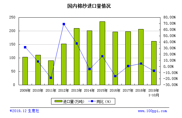 據最新統計數據顯示,2019年10月,我國進口棉紗14.55萬噸,環比下降1.11%,同比上漲3.19%;出口棉紗2.57萬噸,環比上漲3.07%,同比下降8.48%;凈進口量為11.98萬噸,環比下降1.96%,同比增長6.10%。2019年1-10月,我國累計進口棉紗162.23萬噸,同比下降7.10%;累計出口31.84萬噸,同比下降7.35%。 14.63億美元
